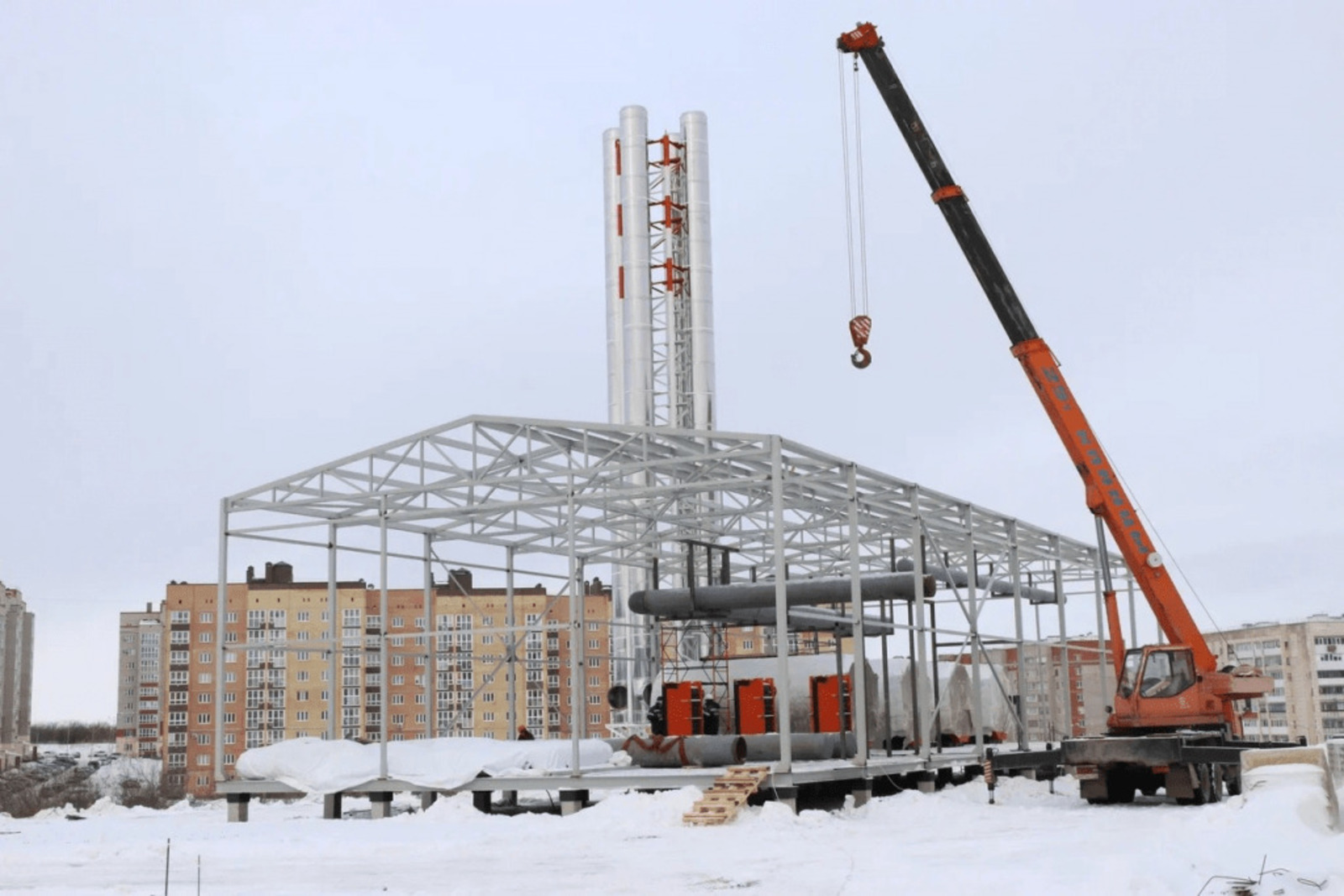 На строительной площадке энергоцентра генеральный подрядчик завершил строительно-монтажные работы по свайному полю для котельной и дымовой труб, вертикальную планировку, заливку монолитного фундамента под надземные резервуары для аварийного топлива. Кроме того, произведен монтаж четырех водогрейных котлов, четырехтрубной дымовой трубы, двух наземных горизонтальных резервуаров аварийного топлива.