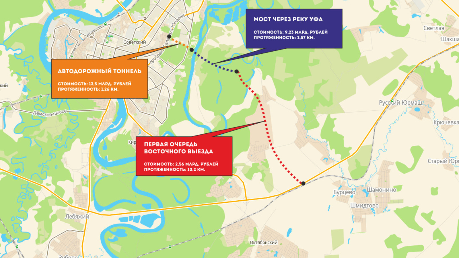Как ранее сообщали городские и республиканские власти, строительство дорог и социальной инфраструктуры позволит ввести в деловой оборот земли вокруг Уфы, что даст дополнительные доходы в городской и региональный бюджет, а также будет способствовать окупаемости инфраструктурных проектов.