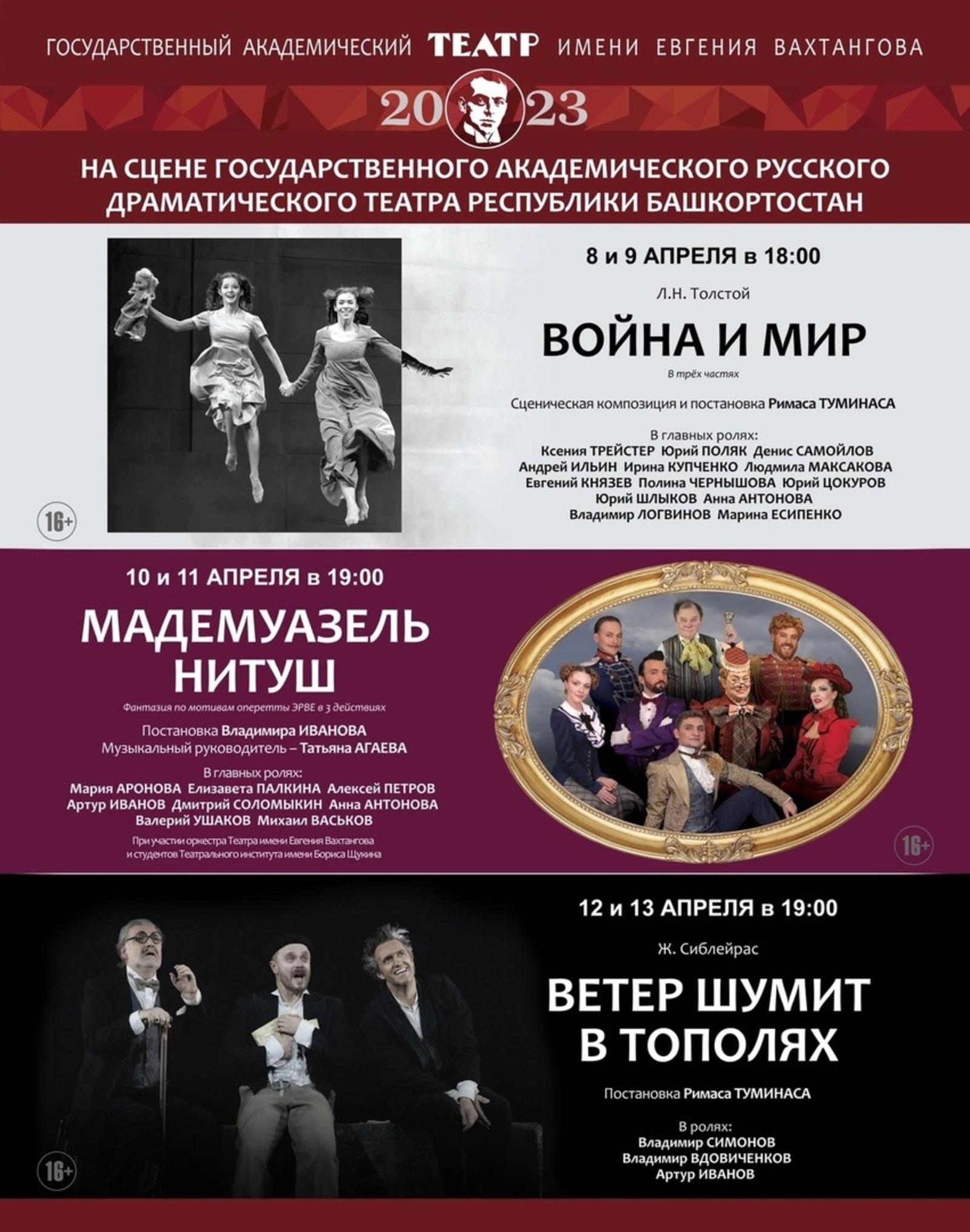 12 и 13 апреля уфимцы увидят «Ветер шумит в тополях» по пьесе Жеральда Сиблейраса. Это ироничная французская трагикомедия для трех актеров. Персонажи – Рене, Фернан и Густав – чудковатые мечтатели, которые постоянно спорят, ссорятся и шутят. Режиссер-постановщик Римас Туминас. Продолжительность спектакля – 2 часа 40 минут.