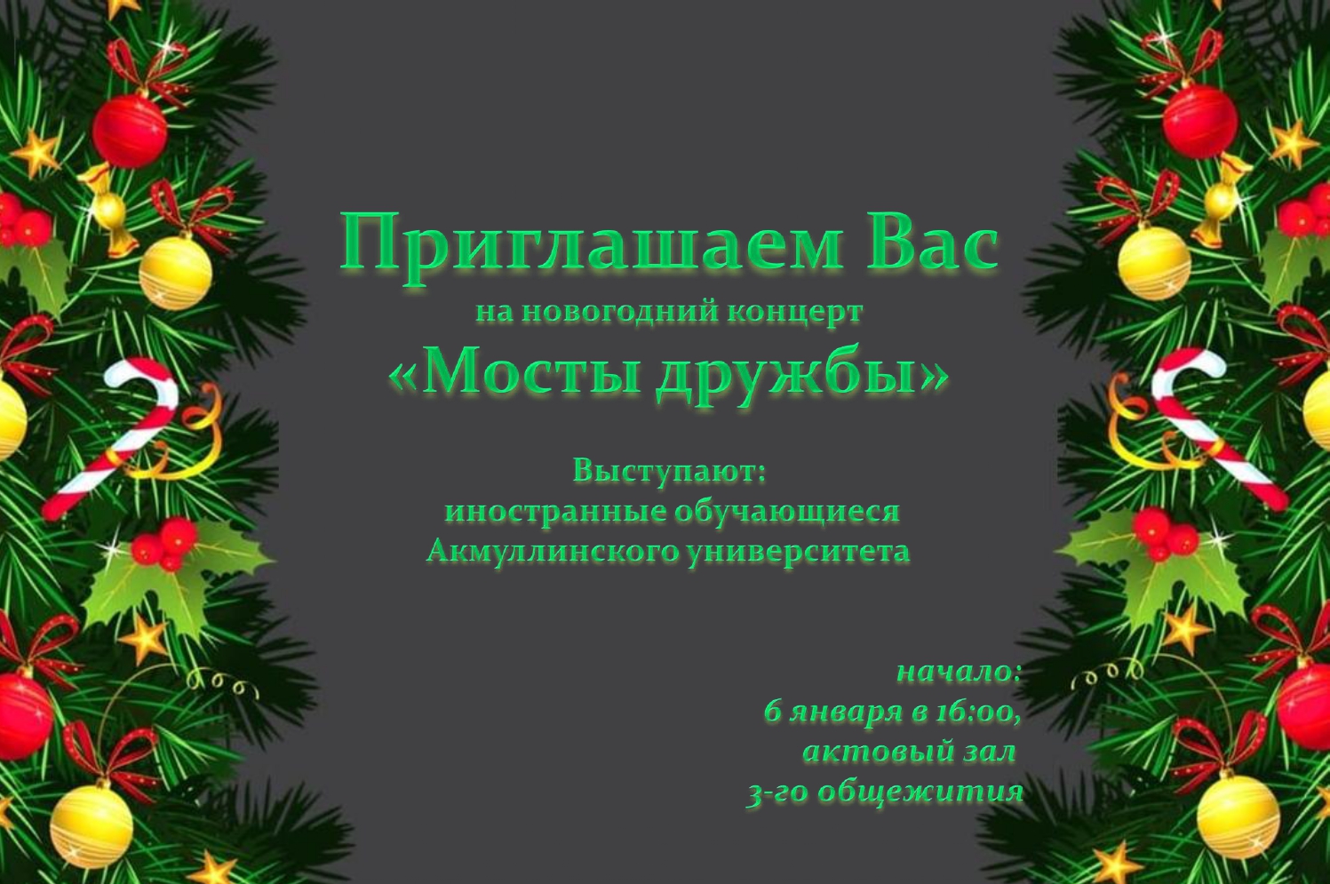 6 января в 16:00 в актовом зале 3 общежития БГПУ им. М.Акмуллы (ул. Свердлова,55) состоится праздничный новогодний концерт «Мосты дружбы» с участием иностранных обучающихся нашего университета.
