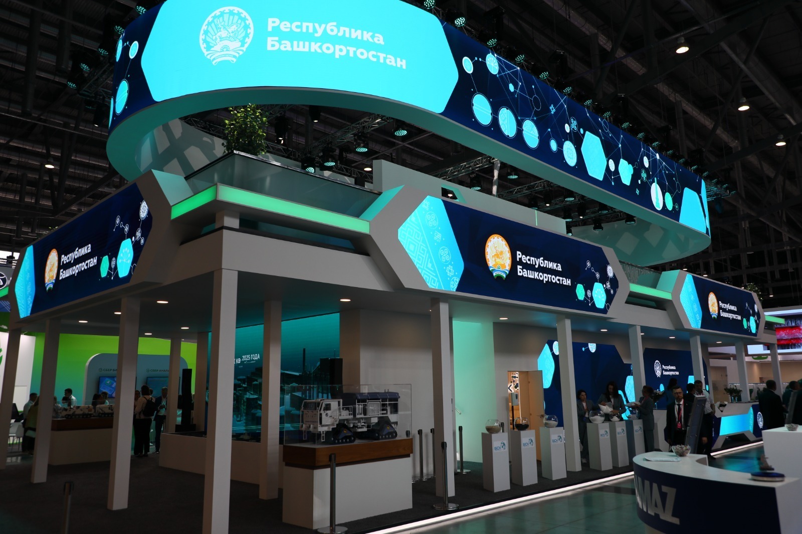 Башкирия представляет на выставке стенд по теме «Развитие нефтехимического комплекса Башкортостана – основа технологического суверенитета России». Кроме того, на стенде в виде макетов представлены электробусы «НефАЗ», болотоходы машиностроительной компании «Витязь», самоходный 30-тонный сейсмический вибрационный источник АО «Башнефтегеофизика» и продукция «Амкодор-Агидель».