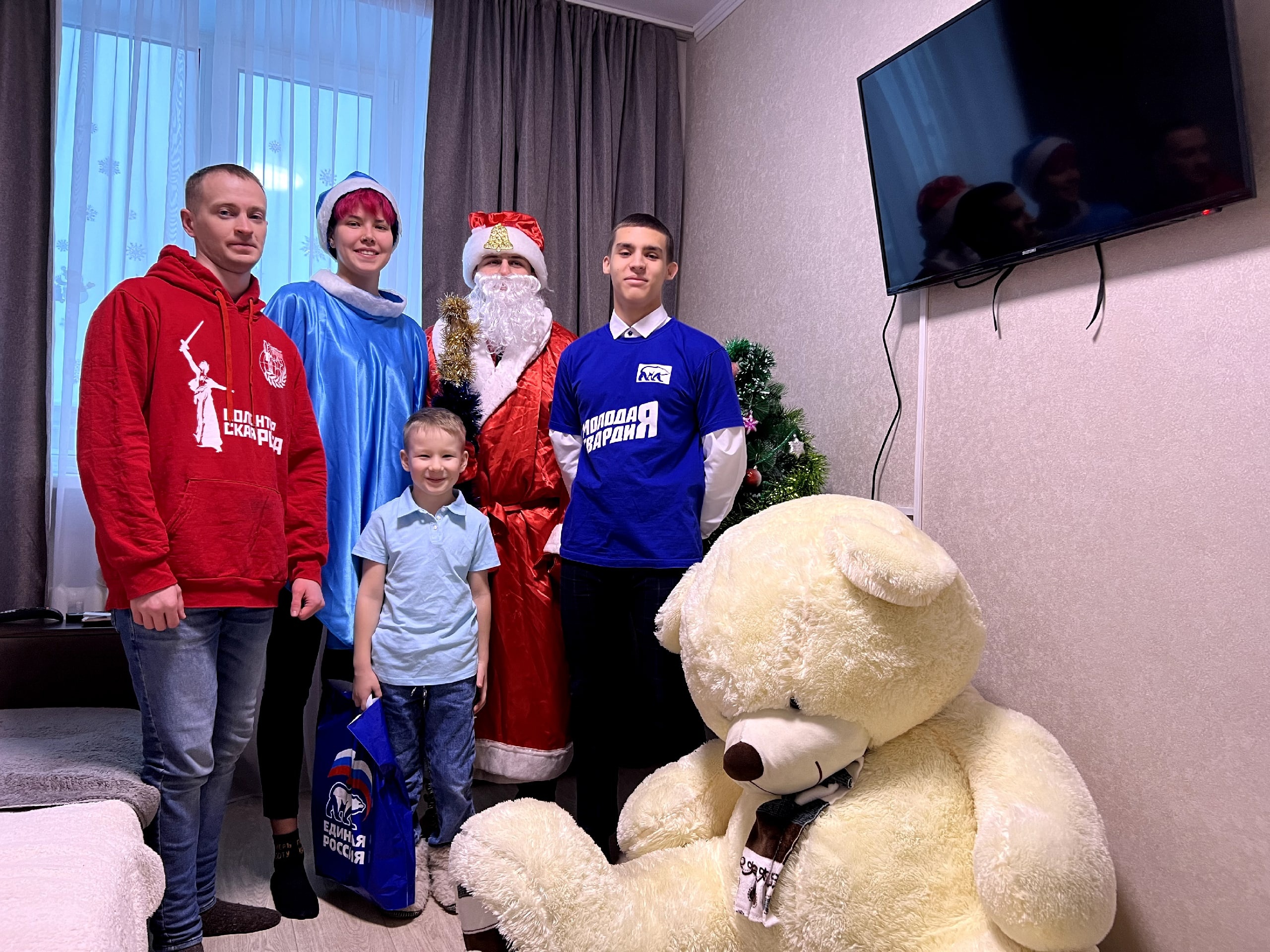 Активисты вместе с Дедом Морозом и Снегурочкой решили поднять настроение сыну военнослужащего. Они поздравили с Новым годом и подарили подарки: огромного плюшевого медведя, игрушки и сладкие угощения. Сын военнослужащего обрадовался приходу гостей и подаркам.