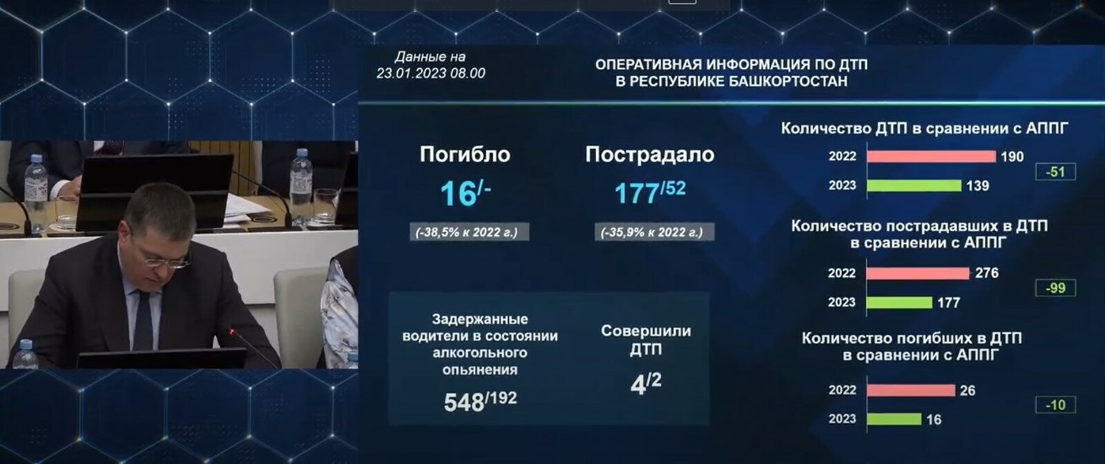В течение семи минувших дней в республике произошла 41 дорожная авария, в которой пострадали 52 человека, погибших, к счастью, нет. С начала года на дорогах Башкирии зарегистрировано 139 ДТП, в результате пострадали 177 человек и погибли 16 — на десять меньше, нежели в прошлом году.