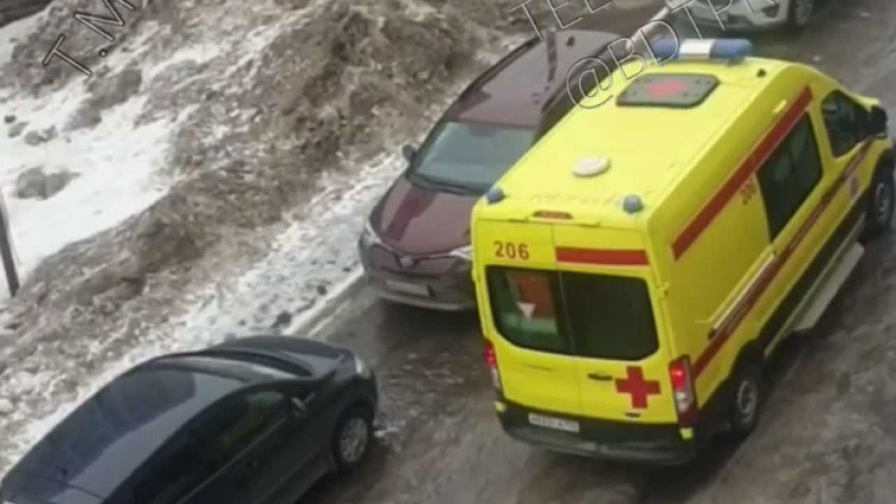 По сообщению свидетелей, водитель машины не мог сдвинуться с места в течение тридцати минут из-за того, что она застряла в колее. Жители дома убрали припаркованные поблизости автомобили, но даже это не помогло реанимобилю выехать.