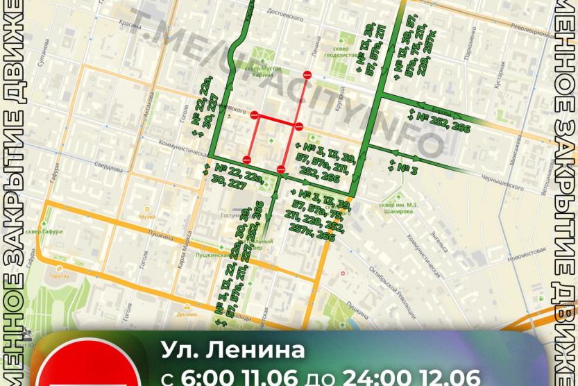 С 6:00 ч. 11 июня и до 24:00 ч. 12 июня в столице республики будет закрыт для проезда участок ул. Ленина – от ул. Коммунистической до Кирова.