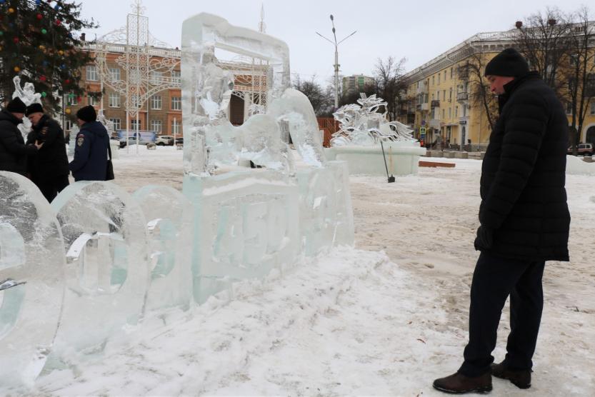 Главные же ледяные скульптуры Деда Мороза и Снегурочки традиционно расположились возле ёлки. Кроме того, её охраняют 4 маленьких ёлочки. Всего на площади установлено 14 ледовых фигур. Это одиннадцать скульптур, лабиринт, горка, а также входная группа. На оформление потребовалось более пятисот плит.