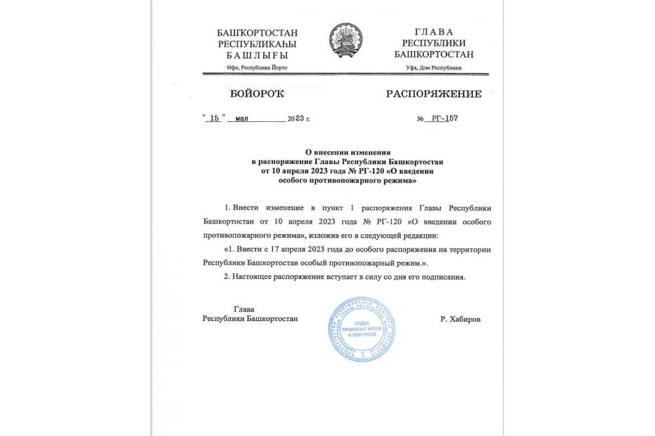 О внесении изменений в Распоряжение о введении особого противопожарного режима на территории Республики Башкортостан