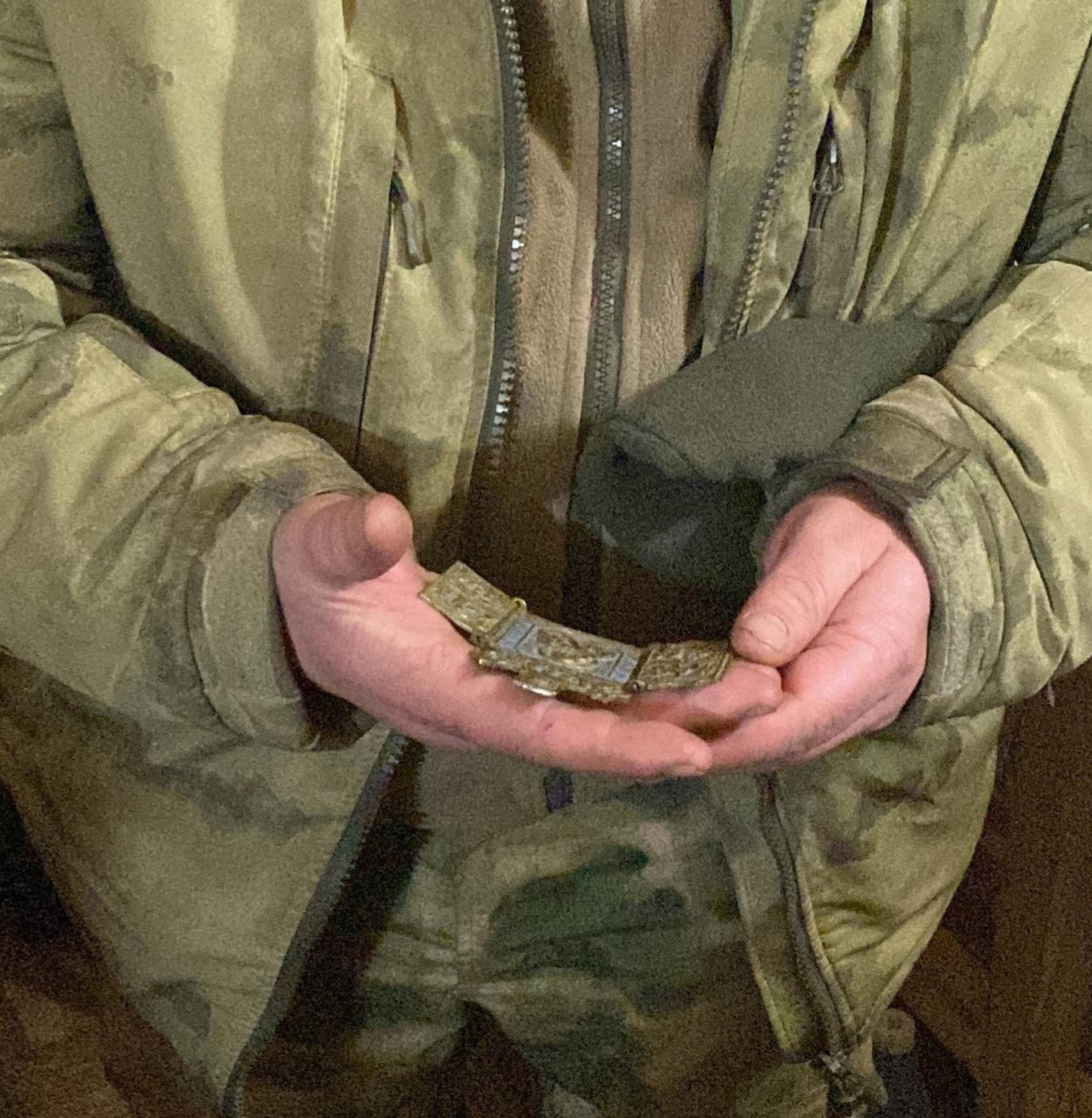 Но старушка как будто прочитала мои мысли и продолжила, объяснив, что это старообрядческий складень Владимирской иконы божьей матери. Очень древний, намоленый. Этот лик когда-то помог изгнать с родной земли в смутное время нечисть с Руси. Поможет и сейчас. Спасёт и сохранит наших защитников.