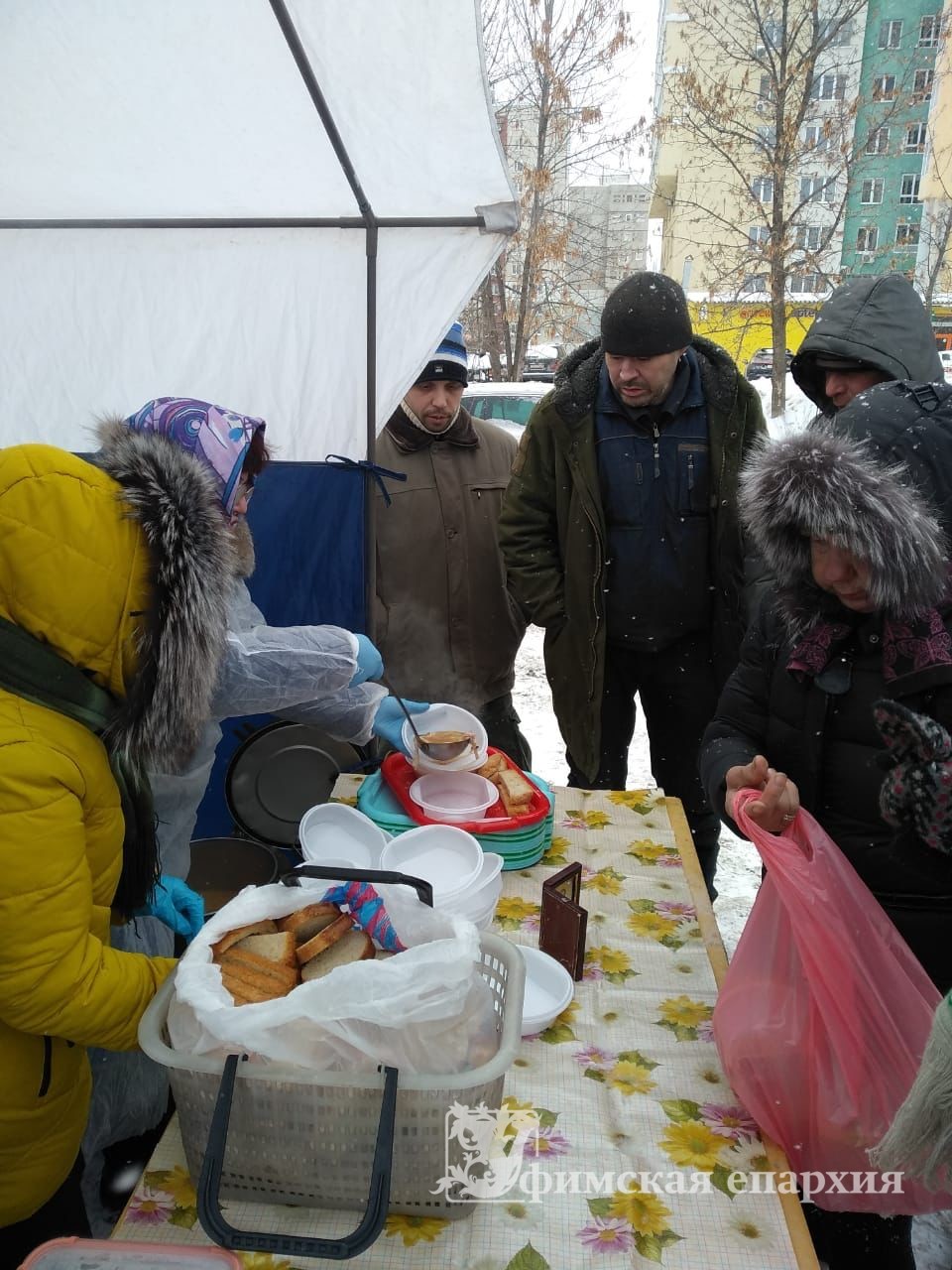 В воскресенье за Гагаринским рынком в мкрн Сипайлово накормили бездомных. В меню был суп из бобовых, макароны с сосиской, чай и домашний хлеб. Пришло покушать 25 человек. Во время служения одна из подопечных упала в обморок — побыли с ней рядом по приезда скорой.