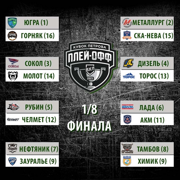 Определились все участники плей-офф.Шестнадцать соискателей главного трофея PARI ВХЛ — Кубка имени Владимира Петрова — в первом раунде плей-офф разделены на пары по принципу: наиболее высокий номер «посева» играет с наименьшим, второй по счету — с предпоследним и т.д. Преимущество своей площадки получают команды с более высоким номером «посева».
