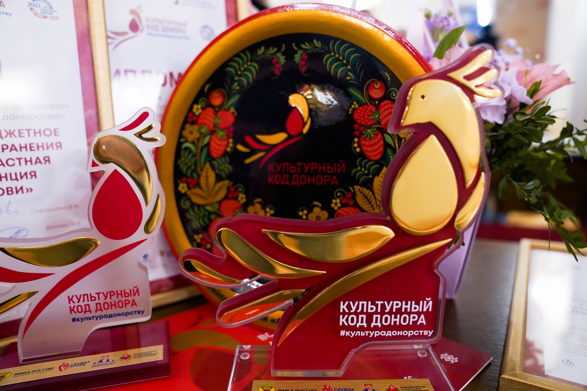 ГБУЗ Республиканская станция переливания крови Республики Башкортостан стала лауреатом номинации «Культурный код донора». Победители номинаций и обладатели специальных призов получили статуэтки в виде жар-птицы - символа акции. Жар-птица из русских сказок, с каплей донорской крови в качестве основного визуального элемента, выполненная в стилистике хохломской росписи, объединила и образ народного наследия, и образ доброго чуда, и образ счастья.