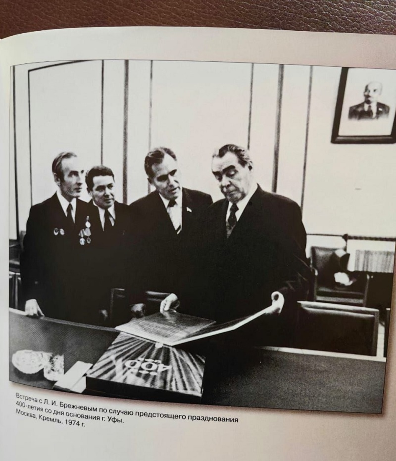 «На этом фото - первый секретарь Башкирского обкома Мидхат Закирович Шакиров (который 18 лет возглавлял нашу республику!) обсуждает с генеральным секретарем КПСС Леонидом Ильичом Брежневым 400-летие со дня образования Уфы», - пояснил фото Радий Хабиров.